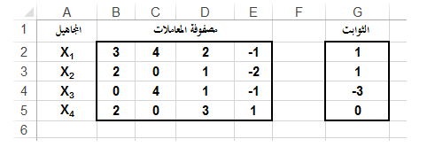 أدخل الصفات السابقة في نطاق من الخلايا المرجعية B18:E15 كما في الشكل التالي: