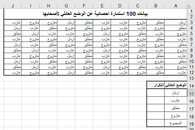 والمطلوب: حساب عدد تكرارات كل صفة من صفات الوضع العائلي (ارمل – عازب – مطلق – متزوج).