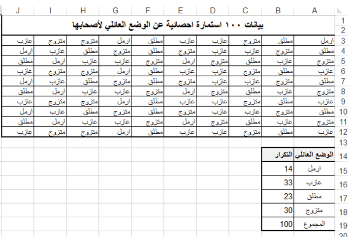 تطبيق عملي (1): ليكن لدينا مئة استمارة احصائية تتضمن بيانات عن الوضع العائلي لأصحابها وهذه البيانات هي: