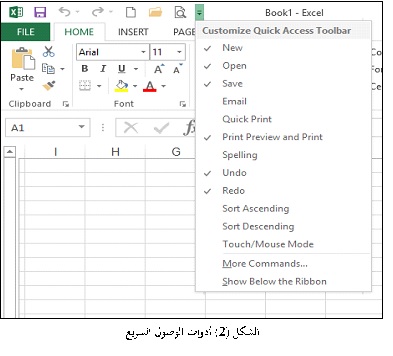 - في الجهة اليسرى من الشريط يوجد (زر التحكم Control Bottom) بالنقر على هذا الزر تظهر قائمة مختصرة تتضمن أوامر التحكم في نافذة الاكسل من تصغير وتكبير واسترجاع وإغلاق، بالإضافة إلى شريط أدوات الوصول السريع Quick Access Toolbar، والذي يضم الأوامر الأكثر استخداماً، أي بمثابة شريط أدوات خاص بك بحيث تكون هذه الأدوات مرئية على الدوام ويمكن إظهار وإخفاء هذه الأدوات من خلال فتح القائمة من السهم الصغير الموجود في الجهة اليمنى لأدوات الوصول السريع، انظر الشكل (2)، وتفعيل الأداة المطلوبة.