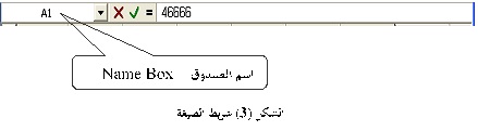 رابعاً- شريط الصيغة Formula Bar: من العناصر الأساسية المكونة لنافذة برنامج الاكسل، يظهر المعلومات والصيغ الرياضية المدخلة في الخلية، بالإضافة إلى أنه يعتبر منطقة تحرير البيانات في الخلية لإجراء الإضافة أو التعديل أو الحذف انظر الشكل (3).