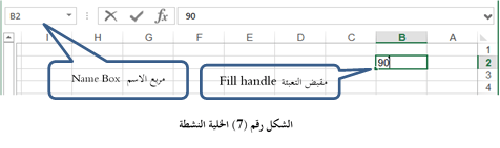 والخلية النشطة هي الخلية المحاطة بإطار أسود غامق ويحمل في الزاوية السفلى مربع صغير يدعى مقبض التعبئة Fill handle انظر الشكل رقم (7)، ويتم تنشيط خلية معينة بالنقر بزر الفأرة الأيسر عليها أو كتابة مرجع الخلية في حقل “مربع الاسم Name Box” في شريط الصيغة، وحسب الشكل رقم (7) الخلية النشطة هي الخلية B2.
