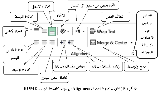 والشكل (10) الذي يوضح ايقونات التحكم بمحاذاة محتوى الخلايا المحددة،