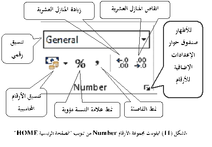 والشكل (11) الذي يوضح ايقونات التحكم بنمط الأرقام في الخلايا المحددة.