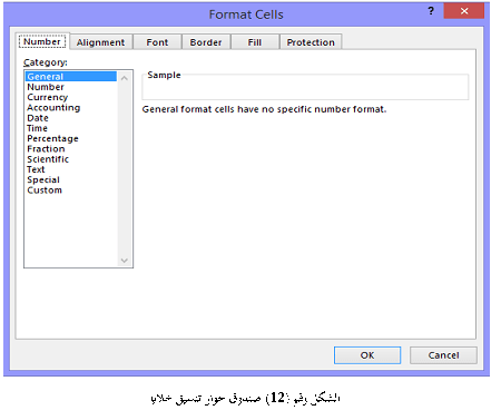 أو انقر على السهم الموجود في مجموعة “محاذاة Alignment” أو مجموعة “خط Font” أو مجموعة “رقم Number” من تبويب “الصفحة الرئيسية Home” فيظهر صندوق حوار كما في الشكل (12)،