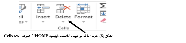 تنويه: يمكن القيام بعملية حذف الخلية (الخلايا) المراد حذفها باستخدام “أيقونة “حذف Delete” من تبويب “الصفحة الرئيسية Home” ضمن مجموعة “خلايا Cells”، انظر الشكل (8).