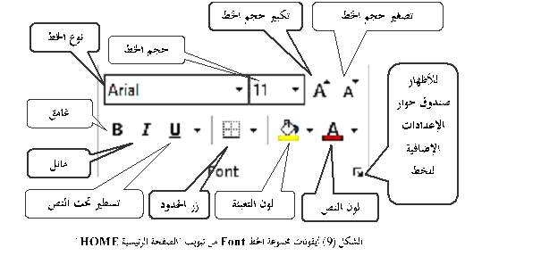 - اختر الأيقونة المناسبة من تبويب “الصفحة الرئيسية Home” انظر الشكل (9) الذي يوضح ايقونات التحكم بشكل خط محتوى الخلايا المحددة وبحدودها،