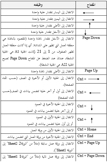 يمكن استخدام بعض مفاتيح لوحة المفاتيح Keyboard للتنقل بين الخلايا عوضاً عن استخدام الفأرة، وفي بعض الأحيان يكون استخدامها أيسر وأسهل من استخدام الفأرة، والجدول التالي يبن اسم المفتاح والوظيفة التي ينفذها: