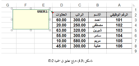 - عندئذ يظهر مربع بداخله مؤشر الإدراج Courser، يمكنك كتابة ما تريد من معلومات عن الخلية من لوحة المفاتيح، نلاحظ أيضا ظهور مثلث صغير احمر اللون في زاوية الخلية موصول مع المربع بسهم، انظر الشكل (13).
