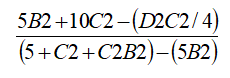 = (5*B2+10*C2–(D2*C2/4))/ ((5+C2+C2*B2)–(5*B2))