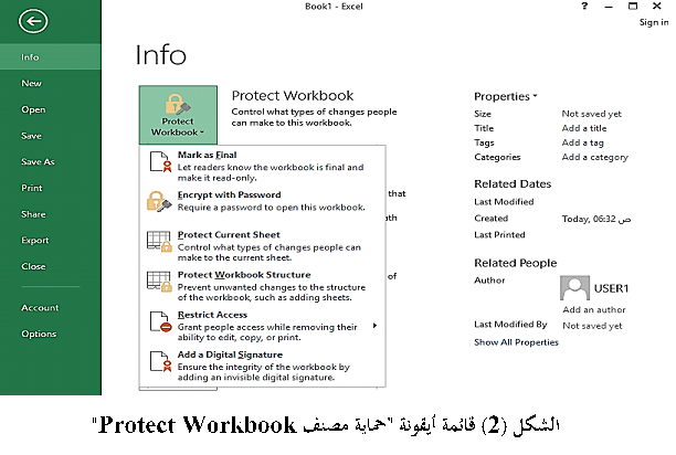 لمنع الآخرين من الاطلاع على محتوى المصنف بعدم فتحه، نقوم بحمايته بكلمة مرور باتباع الخطوات الآتية: