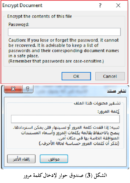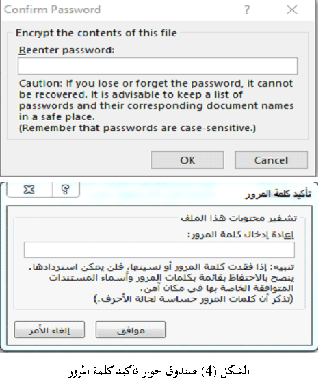 ثالثاً: أدخل في حقل “كلمة مرور Password” كلمة المرور التي ترغب، ثم اضغط على زر “موافق Ok”. عندئذ يظهر صندوق حوار أخر “تأكيد كلمة مرور Confirm Password” كما في الشكل (4) يطلب منك إعادة إدخال كلمة المرور، بالإضافة إلى تحذير يجب على المستخدم أخذه بعين الاعتبار، ثم اضغط على زر “موافق Ok”، عندئذ إذا أغلقت المستند ثم عدت وفتحته سيطلب منك برنامج الاكسل إدخال كلمة المرور.
