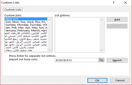 - في قسم “قوائم مخصصة Custom List” تظهر جميع السلاسل النصية المخزنة في الاكسل التي يمكن استخدامها كما شرحنا سابقاً .