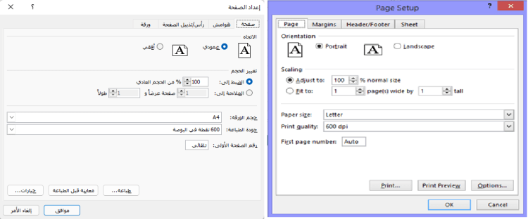 - وفي حال الرغبة بخيارات مخصصة يمكن اختيار الخيار “خيارات التحجيم الخاصة Custom Scaling Options” الذي يقودك إلى ظهور صندوق حوار “اعدادات الصفحة Page Setup” كما في الشكل الآتي: