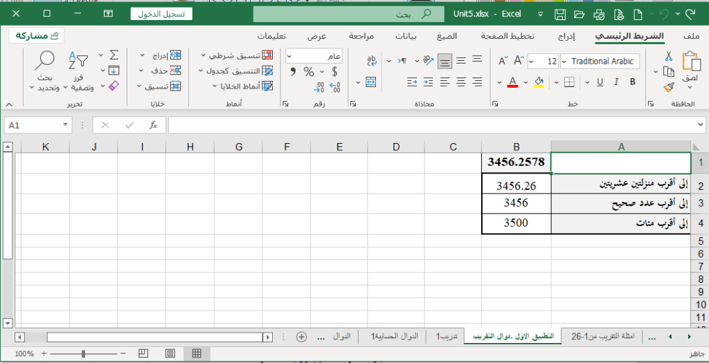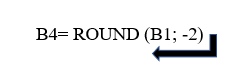 - وبنفس الطريقة لتقريب العدد في 3456.2578 الموجود في الخلية B1 الى أقرب خانة المآت: