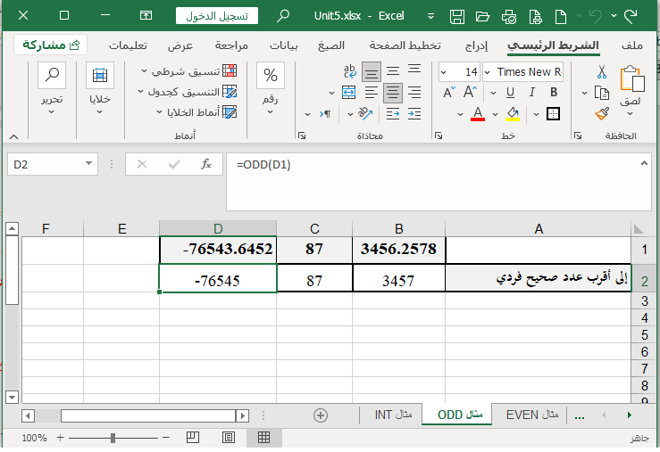 ثالثاً: وبنفس الطريقة لتقريب العدد في (76543.6452-) الموجود في الخلية D1 إلى أقرب عدد صحيح فردي:
