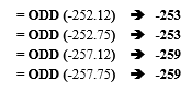 أي أن الحاسوب يقوم أولاً بتقريب العدد المعطى إلى الأعلى لأقرب عدد صحيح، ثم يقوم بتقريب الناتج لأقرب عدد صحيح فردي، كما هو موضح في الجدول التالي:
