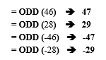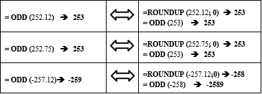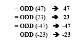 تستخدم الدالة Odd لتقريب الأعداد الموجبة إلى الأعلى نحو أقرب عدد صحيح فردي والأعداد السالبة إلى الأدنى نحو أقرب عدد صحيح فردي.
