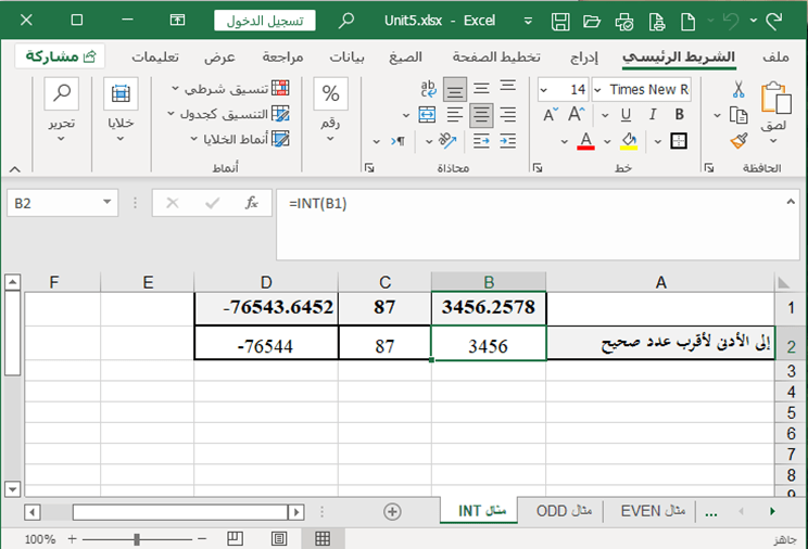 تستخدم الدالة INT لتقريب الأعداد إلى الأدنى نحو أقرب عدد صحيح.