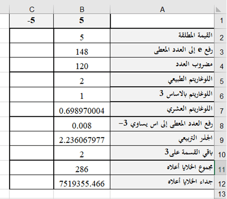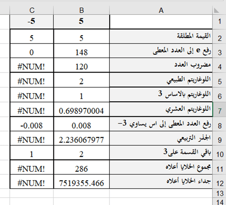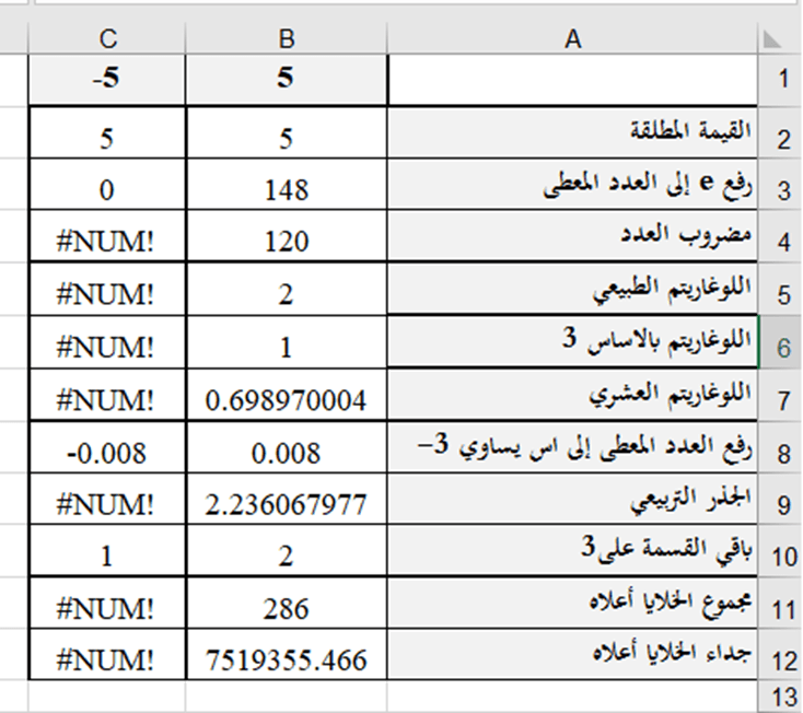 - ظهور #NUM! في الخلايا C4 و C5 و C6 و C7 و C9 لأن الدوال المستخدمة لا تتعامل مع القيم السالبة.