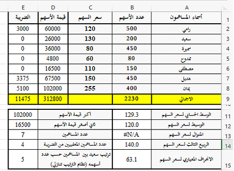 | عدد المساهمين المعفيين من الضريبة | E14 = COUNTIF (E2:E8;”=0″) |