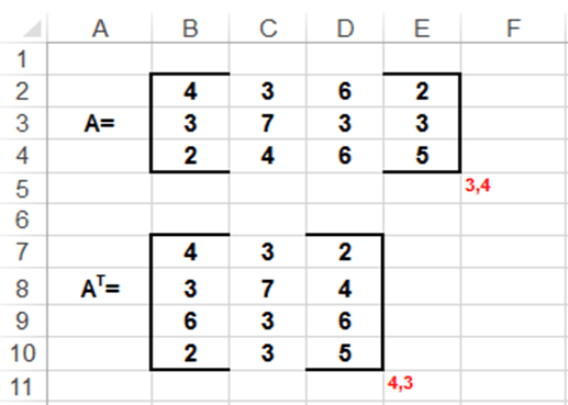 ولإيجاد منقول مصفوفة باستخدام الاكسل نستخدم الدالة TRANSPOSE، باتباع الخطوات الآتية: