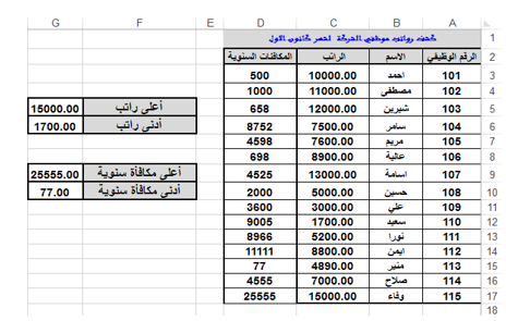 - للبحث عن أدنى مكافأة سنوية نكتب في الخلية G10: