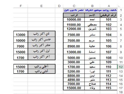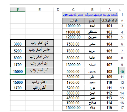 - للبحث عن أعلى راتب (آخر أصغر راتب) نكتب في الخلية F10: