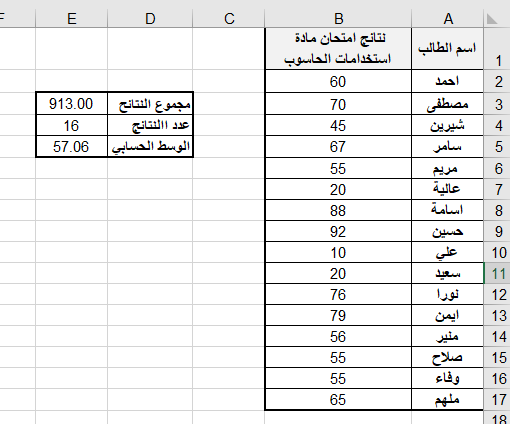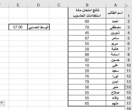 تطبيق عملي (1): لحساب الوسط الحسابي لنتائج الطلاب في امتحان استخدامات الحاسوب حسب ورق العمل الآتية:
