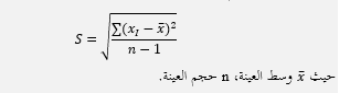 أولاً: الانحراف المعياري لعينة مأخوذة من مجتمع: وهو الجذر التربيعي الموجب لحاصل قسمة مجموع مربعات فروق القيمة عن وسطها الحسابي على عددها ناقص واحد، ويحسب في الإحصاء باستخدام العلاقة: