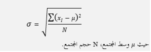 ثانياً: الانحراف المعياري للمجتمع بأكمله: وهو الجذر التربيعي الموجب لحاصل قسمة مجموع مربعات فروق القيمة عن وسطها الحسابي على عددها، ويحسب في الإحصاء باستخدام العلاقة: