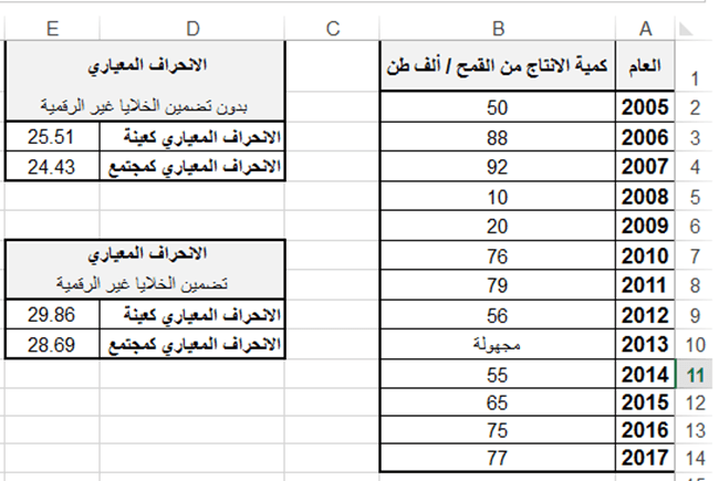 - اكتب الدالة المناسبة لحساب كل من الانحراف المعياري لكميات الإنتاج من القمح في الحالتين: الأولى بدون تضمين الخلايا التي تحوي على نص والثانية تضمين الخلايا التي تحوي على نص، على اعتبار البيانات كعينة من مجتمع.