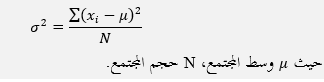 ثانياً: التبياين للمجتمع بأكمله: وهو حاصل قسمة مجموع مربعات فروق القيمة عن وسطها الحسابي على عددها، ويحسب في الإحصاء باستخدام العلاقة: