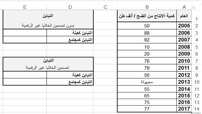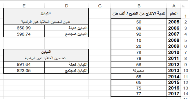 - اكتب الدالة المناسبة لحساب كل من التباين لكميات الإنتاج من القمح في الحالتين: الأولى بدون تضمين الخلايا التي تحوي على نص والثانية تضمين الخلايا التي تحوي على نص، على اعتبار البيانات كعينة من مجتمع.