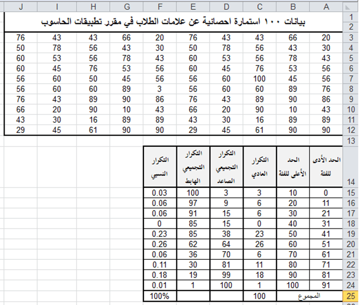 | بيانات 100 استمارة احصائية عن علامات الطلاب في مقرر تطبيقات الحاسوب | |||||||||
