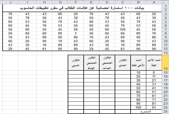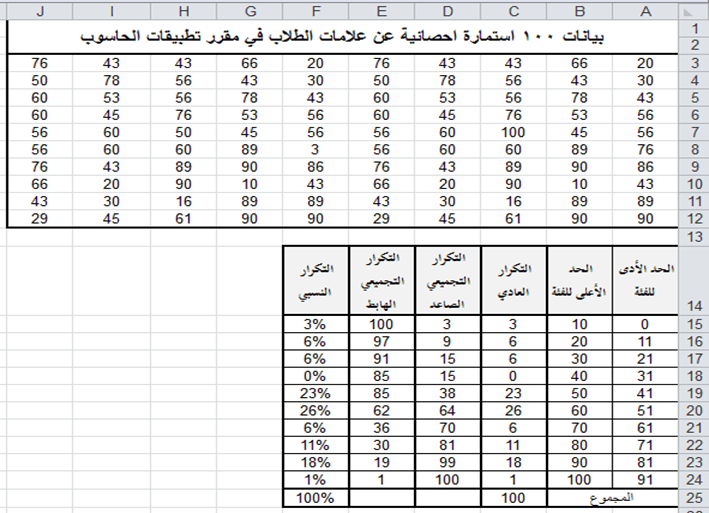 تطبيق عملي (1): احسب التكرارات العادية لبيانات 100 استمارة إحصائية تتضمن علامات الطلاب في مقرر تطبيقات الحاسوب وهي: