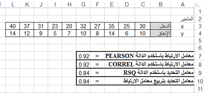 يتضمن برنامج Microsoft Excel دالتين إحصائيتين لحساب معامل الارتباط PEARSON و CORREL. ودالة RSQ لحساب معامل التحديد