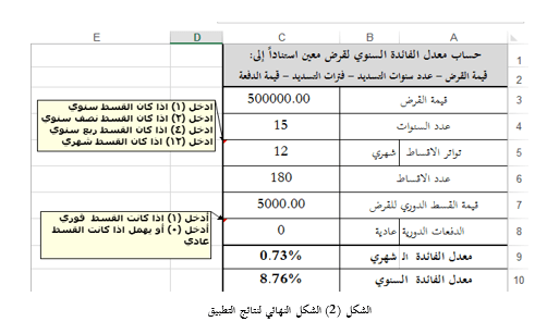 من النموذج الشكل (2) الذي توصلنا إليه لاحظ أن معدل الفائدة السنوي لتسديد قرض معلوم مقداره 50000 ل.س لمدة 15 سنة، على أن يسدد على شكل أقساط شهرية بقيمة 5000 ل.س، يساوي 8.76%، وهذه القيمة تتغير من أجل أي تغيير في قيم المدخلات (القيمة الحالية للقرض – عدد سنوات سداد القرض – تواتر الأقساط – قيمة القسط حسب تواتر الأقساط – نوع دفعة القسط)، حيث ستحصل على النتائج مباشرة دون اللجوء إلى تصميم النموذج مرة ثانية.