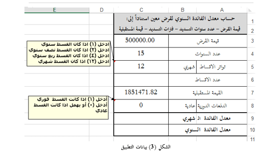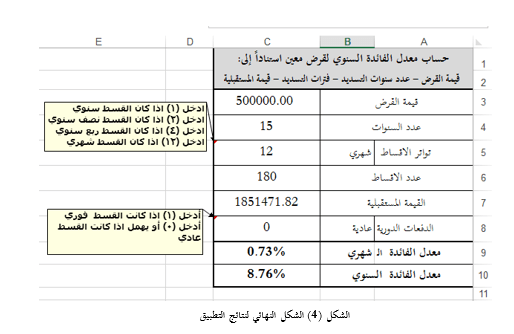 ممن النموذج الشكل (4) الذي توصلنا إليه لاحظ أن معدل الفائدة السنوي لتسديد قرض معلوم مقداره 50000 ل.س لمدة 15 سنة وقيمته المستقبلية معلومة ومقدارها 1851471.82 ل.س، على أن يسدد على شكل أقساط شهرية، يساوي 8.76%، وهذه القيمة تتغير من أجل أي تغيير في قيم المدخلات (القيمة الحالية للقرض – عدد سنوات سداد القرض – تواتر الأقساط – القيمة المستقبلية للقرض – نوع دفعة القسط)، حيث ستحصل على النتائج مباشرة دون اللجوء إلى تصميم النموذج مرة ثانية.