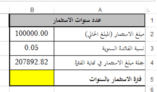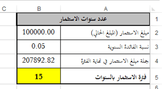 بفرض أننا نريد إيداع مبلغ ما وليكن 100000 ل.س في أحد المصارف بمعدل فائدة سنوية مركبة 5% للحصول على مبلغ 207892.82، فما هو عدد سنوات الاستثمار؟