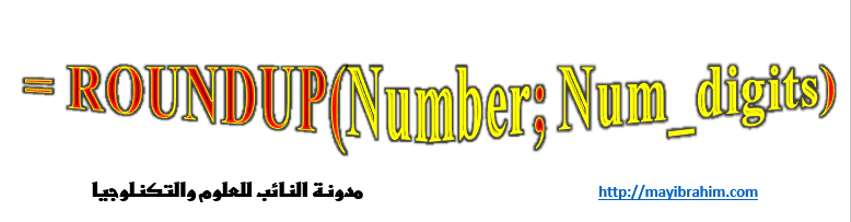 تستخدم الدالة ROUNDUP لتقريب العدد إلى الأعلى بعدد محدد من الخانات (المنازل) حسب، ولها وسيطين كما موضح في الشكل العام لهذه الدالة: