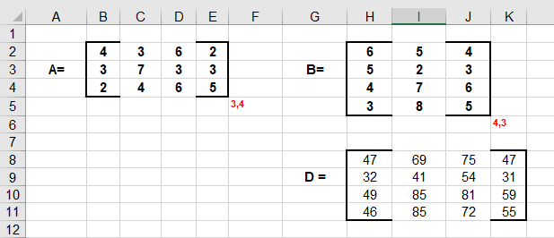 - اسحب مقبض التعبئة للخلية H3 افقياً على الخلايا I3، J3، K3 تظهر عناصر الصف الأول من المصفوفة B.